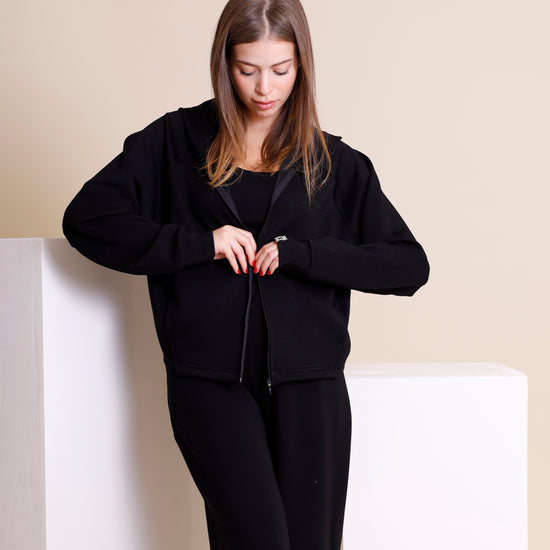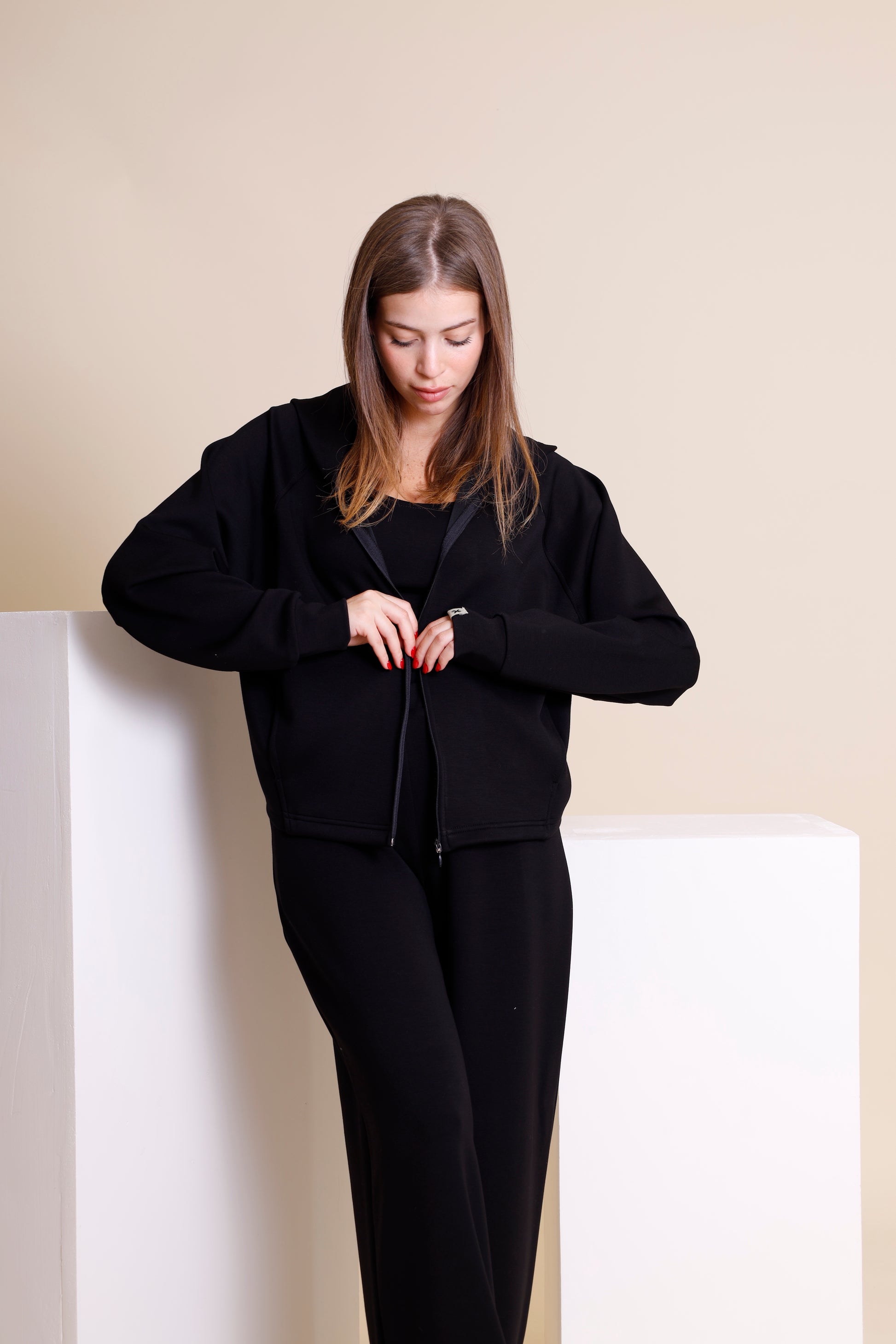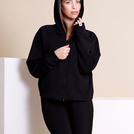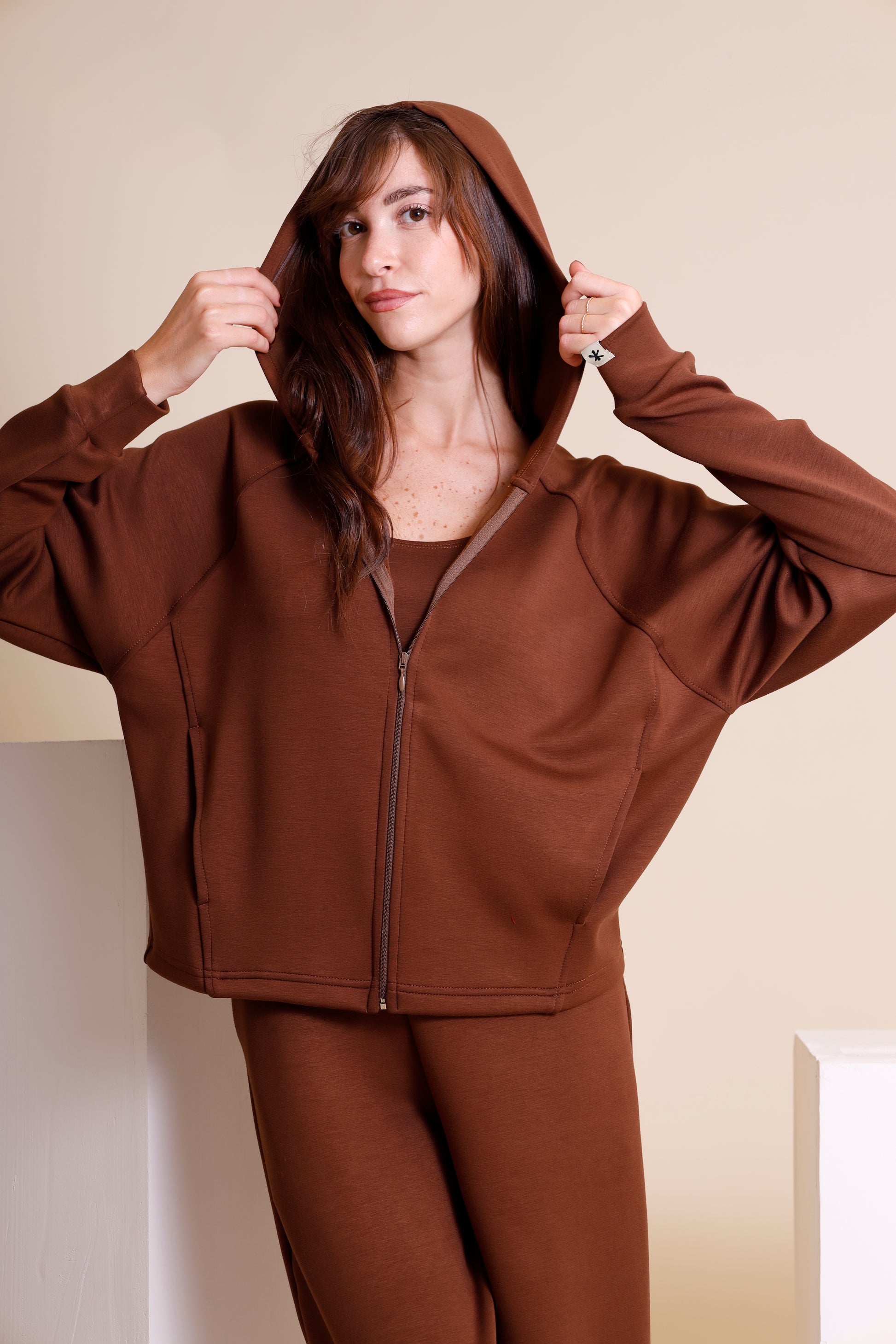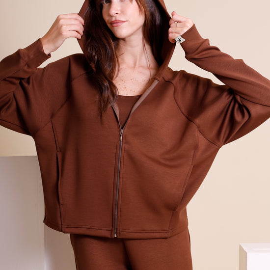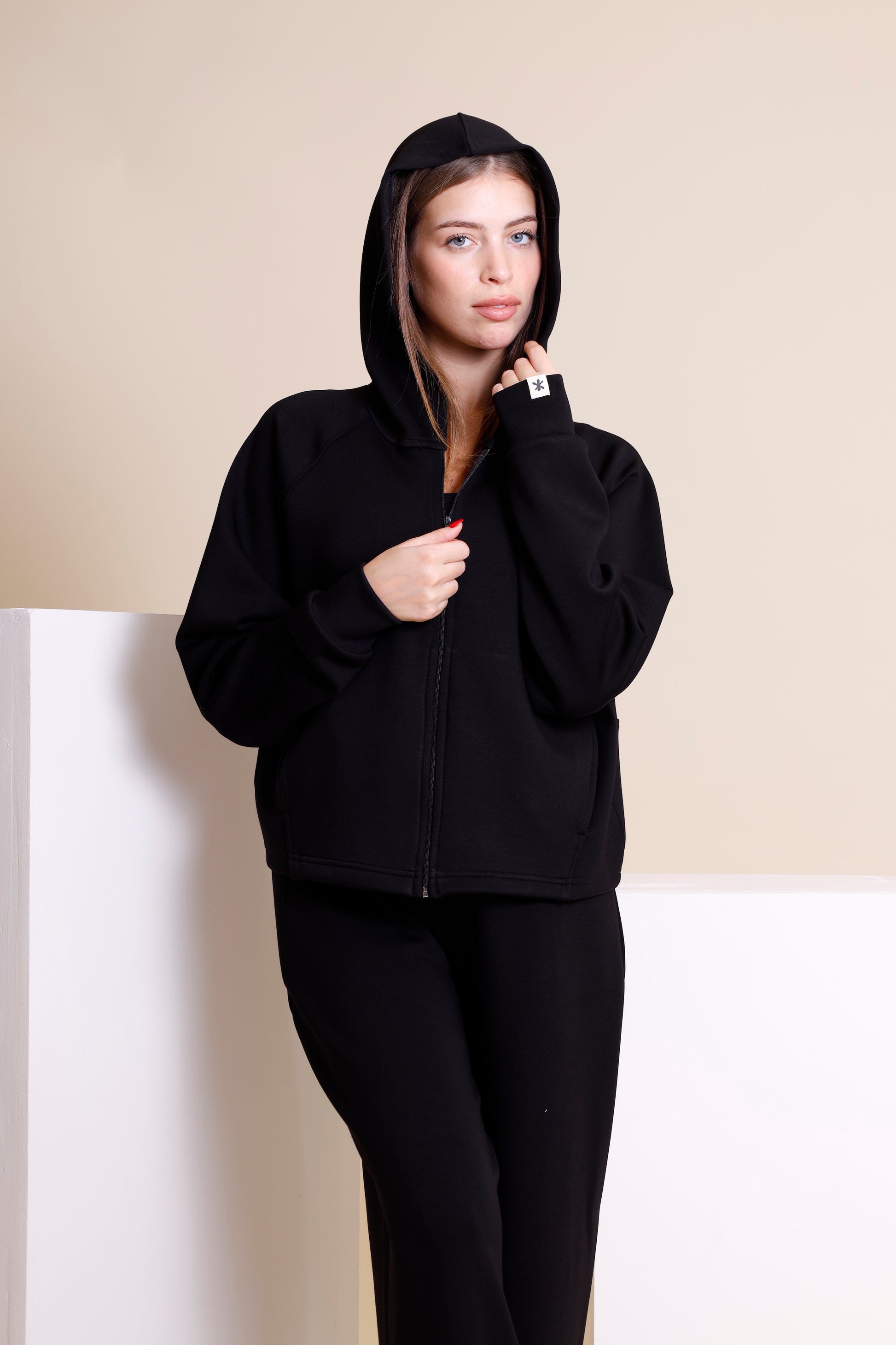 Meet the Cloud Bomber - your new cozy essential in our signature ultra-soft cloud fabric. Designed in a relaxed silhouette with dropped shoulders and a smooth front zipper, it’s perfect for layering over your everyday looks. The hood adds warmth and ease, while the plush texture keeps comfort at the core.